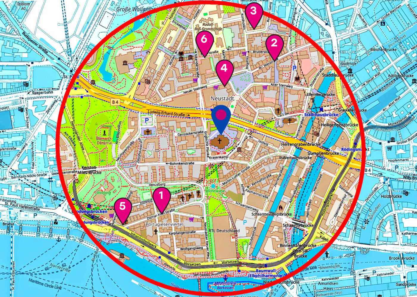 Wir sind nun in der nördlichen Neustadt, um auf der Michaelisbrücke Richtung Fleetinsel zu schauen. Was kaum einer weiß, so Bartz: Der Großteil der Insel steht im Privateigentum. Auch ein Grund dafür, dass es auf der Fleetinsel nur wenige Veranstaltungen gibt. Dass die Michaelisbrücke inoffiziell Liebesbrücke genannt wird, verdankt sie den Vorhängeschlössern, die in Massen am Portal hängen. Ansonsten gibt es hier keine Spuren von Overtourism zu sehen. Abseits von Portugiesenviertel und Michel ist es ziemlich ruhig in der Neustadt. „Das kleine Dorf in der Großstadt“, nennt es Bartz. Für Besucher, die mehr vom Stadtteil wissen wollen, hat er den „Hummel-Bummel“ geschaffen. Mit roter Farbe ist der Rundgang auf dem Weg markiert. „Zweimal im Jahr muss ich die Farbe erneuern.“