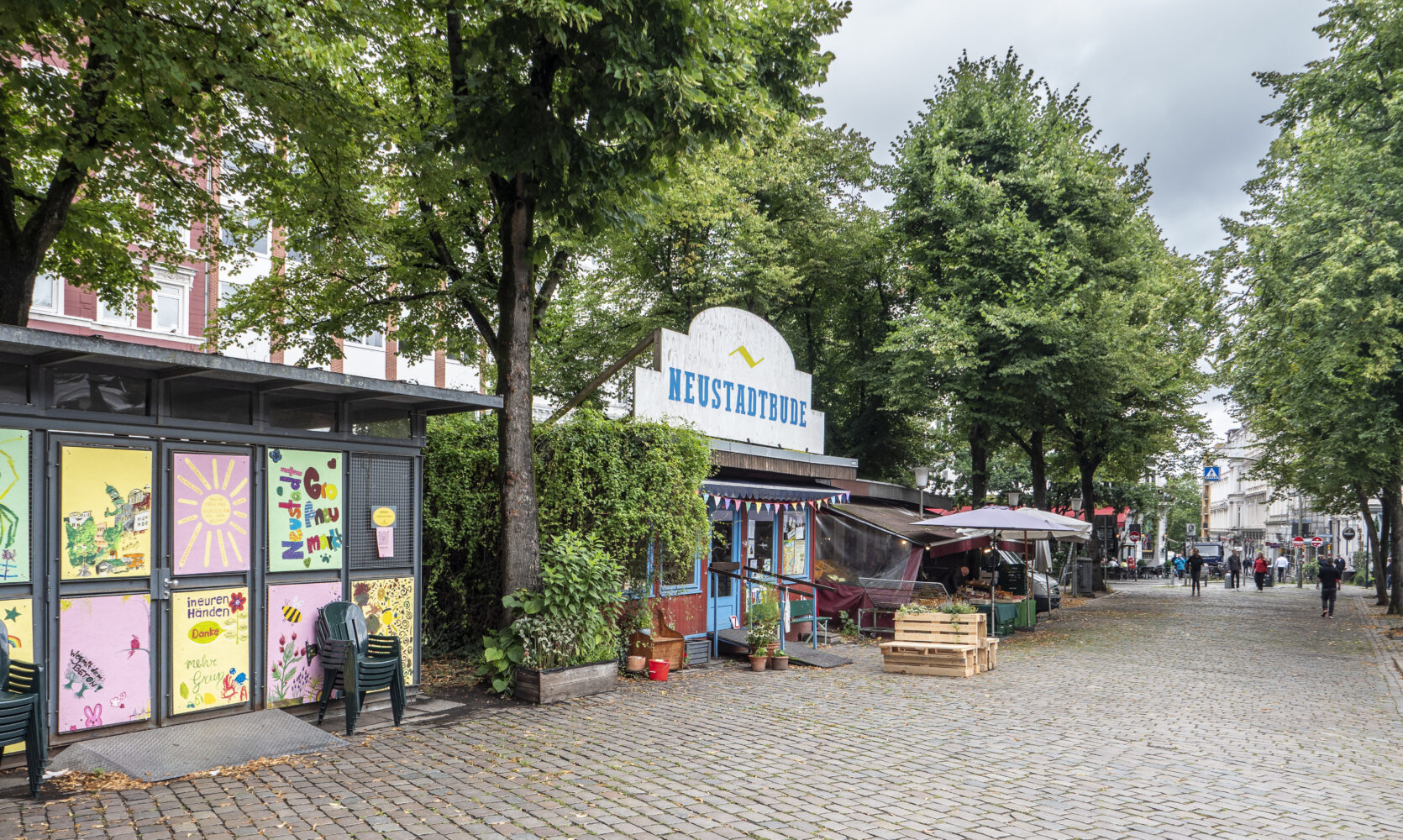 Bevor wir am Alten Steinweg den Cotton Club links liegen lassen, berichtet uns Bartz, dass der legendäre Jazzclub mittlerweile eine neue Leitung hat. In den 1970er-Jahren gab es rund um den Großneumarkt zahlreiche ähnliche Szenelokale. Das änderte sich um die Jahrtausendwende „von der Nachtökonomie mit Bars und Kneipen hin zu Restaurants und inhabergeführten Läden“, so Bartz. In der engen Steinwegpassage erinnert nur noch die Dachkonstruktion an die erste Einkaufspassage der Stadt. Das Banksy-Graffito „Bomb Hugger“, das der Künstler hier 2002 an einen Betonpfeiler gesprayt hat, ist nur noch zu erahnen. Als jemand eine Flüssigkeit an der Wand entlang kippte, half auch die davor angebrachte Glasplatte nicht. Es geht nun die Wexstraße hinauf zum Großneumarkt. Rund um die Neustadtbude fand hier im August das Neustadtfest statt. Auch Stefan Gwildis, dessen Großmutter in der Rambachstraße eine Kneipe führte, trat auf und blieb nach dem Konzert zum längeren Klönschnack.