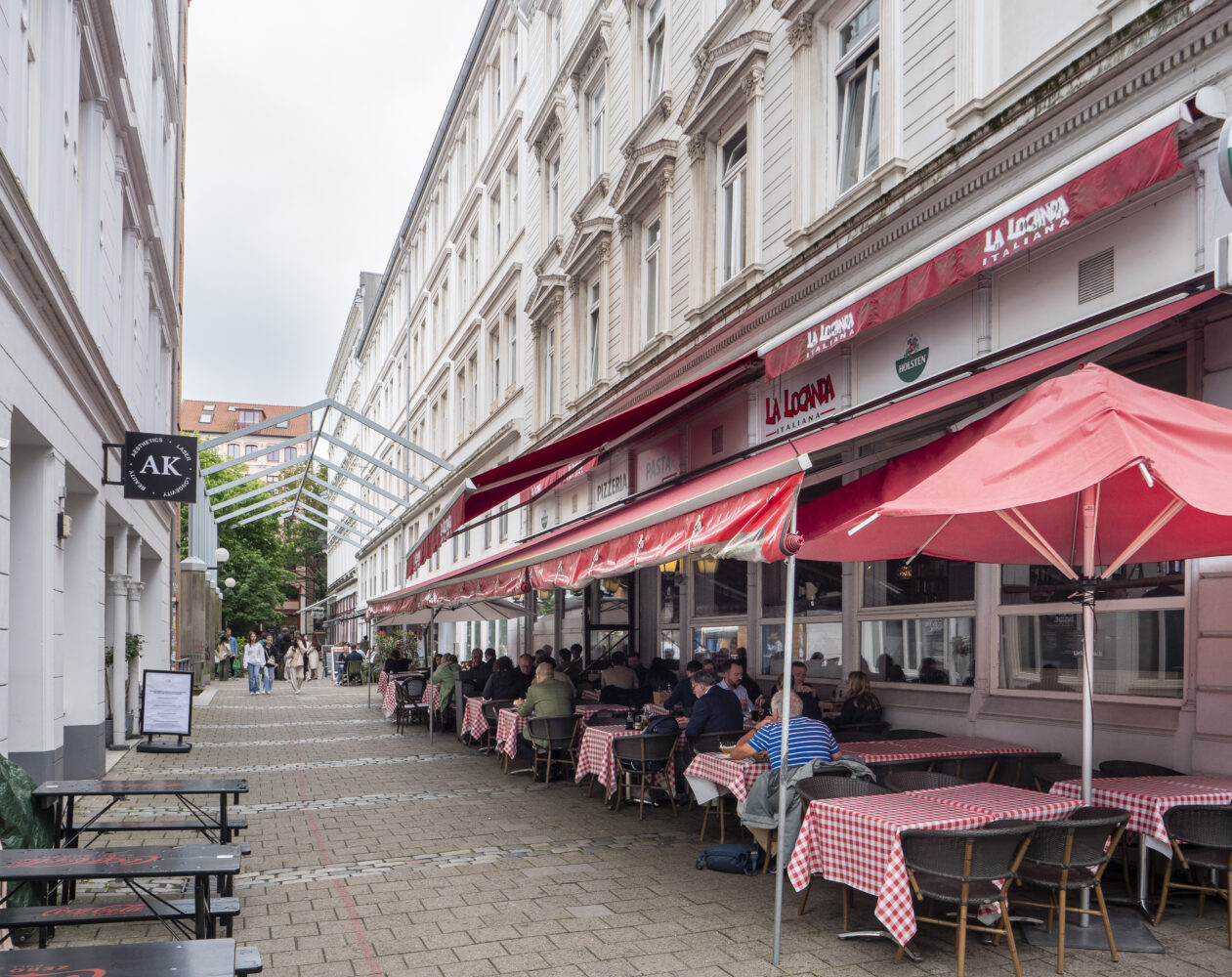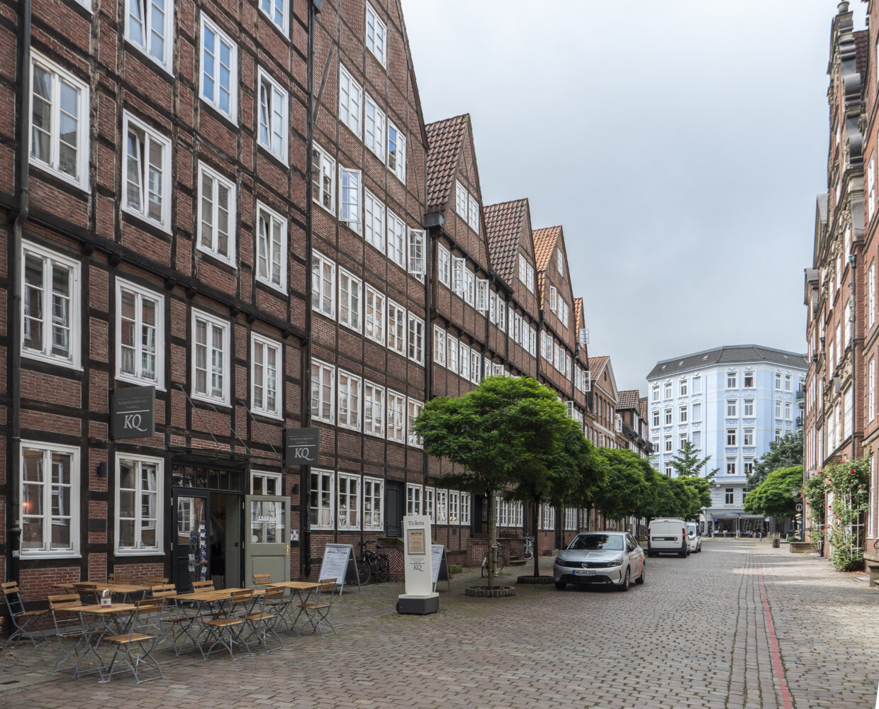 Etwa genauso lange ist Sascha Bartz, der mit uns nun in Richtung Portugiesenviertel aufbricht, Quartiersmanager der Neustadt. 2004 begann der Architekt und Stadtentwickler in einem studentischen Nebenjob, aus dem der gebürtige Hamburger eine eigene Firma gemacht hat. Bartz, Dreitagebart und Outdoor-Kapuzenjacke, wird auf unserem Rundgang einige Male von Passanten begrüßt. So auch am Eingang zur Ditmar-Koel-Straße vor der schwedischen Gustaf-Adolfs-Kirche, die Hamburger vor allem durch die stilvollen Weihnachtsmärkte kennen. „Viele, die hier zur Kirche gehen, kommen aus ganz Hamburg und NorddeutschlandC, so Bartz. Auf der anderen Straßenseite sind hier blaue Linien gemalt worden. Innerhalb der Linie dürfen Tische und Stühle stehen, daneben nicht „Das war der erste Ort in Hamburg, an dem es das gab. War zuvor ein ziemlicher Wildwuchs.“ Nun kommen Fußgänger wieder besser durch, selbst wenn vor den Restaurants, Cafés und Bars Hochbetrieb herrscht. Während neben uns durch eine Kellerluke Fisch in Kisten aus Styropor angeliefert wird, erzählt Bartz eine Geschichte erfolgreicher Einwanderung. In die damals noch günstigen Wohnungen der südlichen Neustadt zogen ab den 1960er- und 1970er-Jahren portugiesische Hafenarbeiter mit ihren Familien. Mit dem verdienten Geld eröffnete die zweite und dritte Einwanderungsgeneration gastronomische Betriebe, die heute in keinem Hamburg-Reiseführer fehlen.