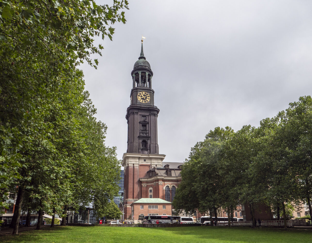 Etwas nordöstlich steht die Hauptkirche St. Michaelis. Eine der bekanntesten Sehenswürdigkeiten der Stadt. Um 10 und 21 Uhr spielt der Michel-Türmer auf 83 Metern Höhe für den Stadtteil. Wir blicken hinunter auf die Michelwiese mit dem leerstehenden Gruner+Jahr-Gebäude. Der New Yorker Immobilienkonzern Tishman Speyer hat das denkmalgeschützte Haus gekauft und wollte sich schon längst in der Stadtteilkonferenz vorgestellt haben. Hat er aber noch nicht, so Bartz. „Wir sind gespannt, was dort geplant ist.“